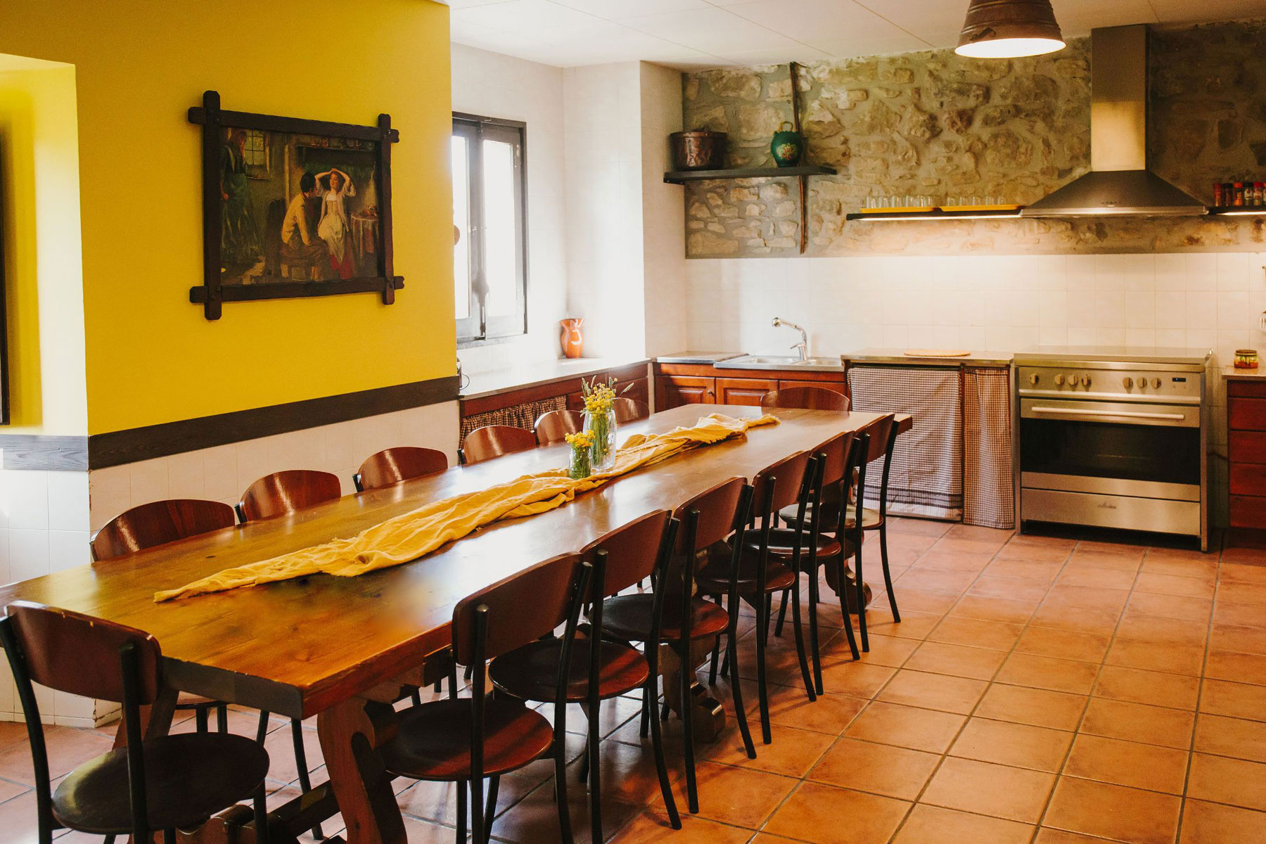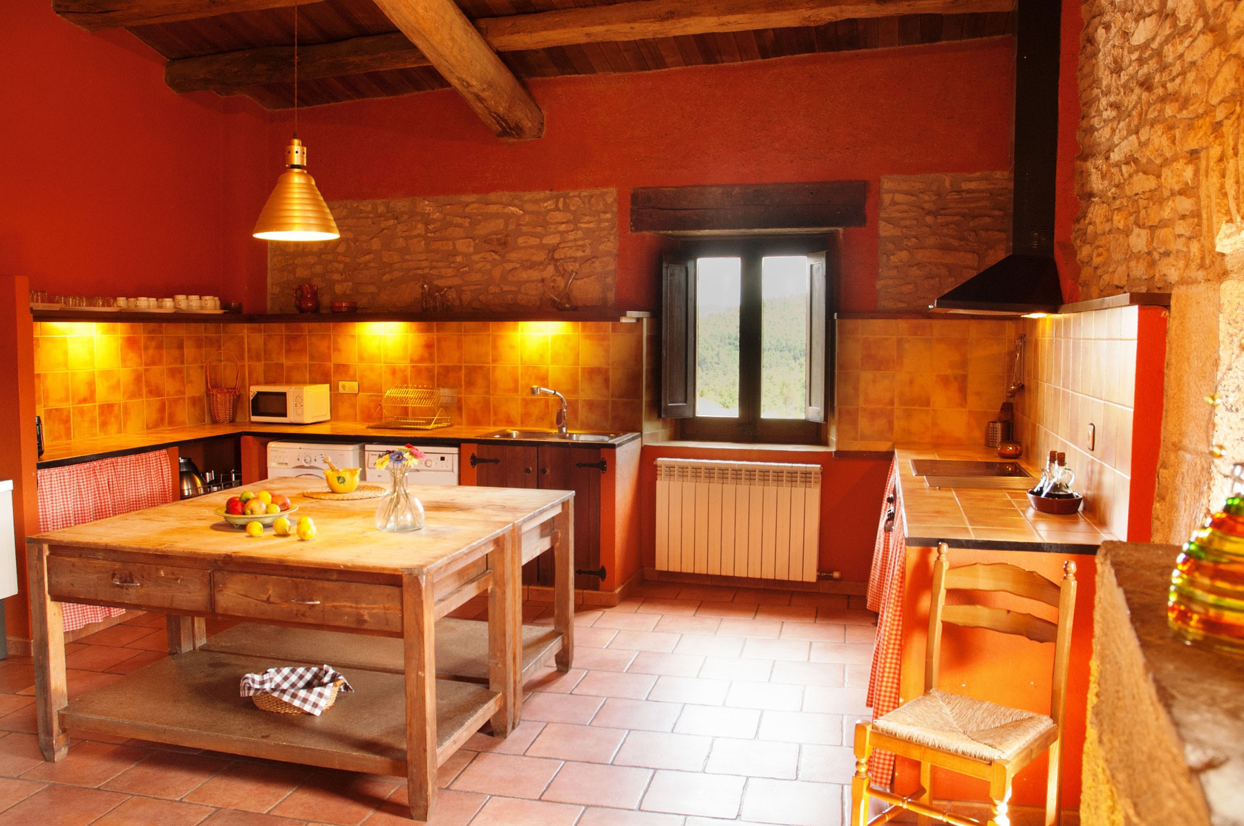 Cocinas / Despensa: 2 lavavajillas, 3 frigoríficos con pequeño congelador en la parte superior, 2 arcones frigoríficos, cocina industrial con horno (interior 80 x 45 cm) en Cal Miralles y cocina doméstica con horno (interior 45 x 40 cm) en Mas Baruls, 2 paelleros, 2 batidoras de mano, 2 exprimidores, 2 tostadoras, 2 cafeteras Dolce Gusto, 2 cafeteras italianas, 2 jamoneros y menaje en general. Trapos de cocina, jabón lavavajillas, bayetas, esponjas y jabón de fregar a mano. Otra chimenea en la cocina de Cal Miralles.